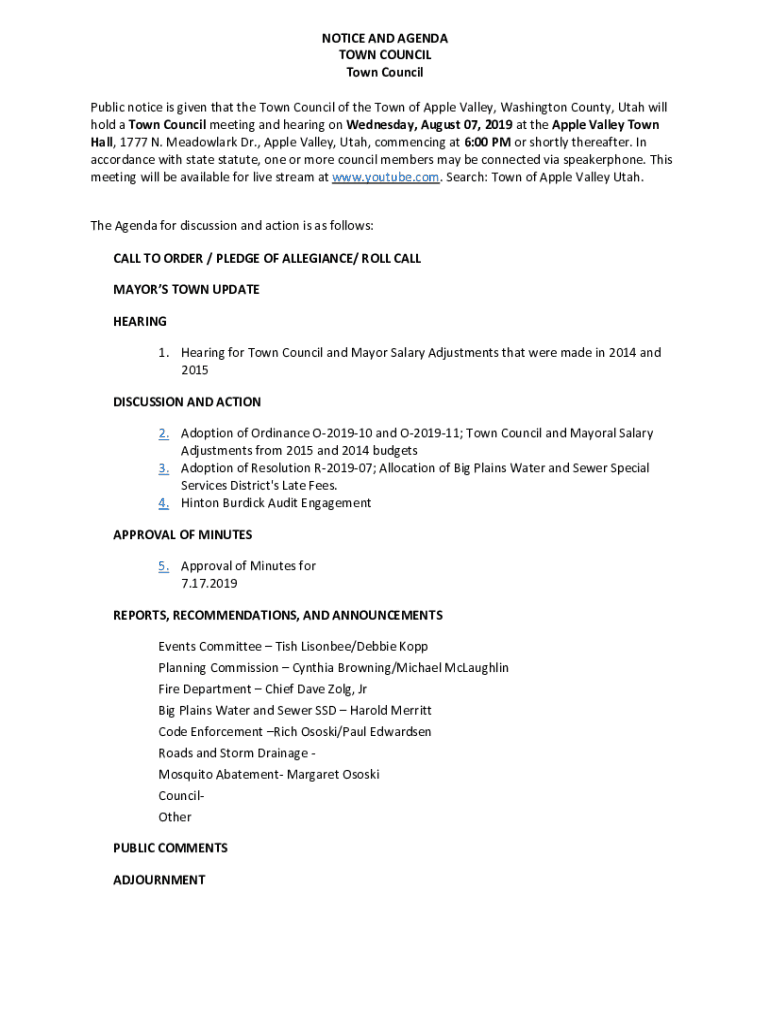 NOTICE AND AGENDA TOWN COUNCIL Public notice is given that the Town Council of the Town of Apple Valley, Washington County, Utah will hold a Town Council meeting and hearing on Wednesday, August 07,