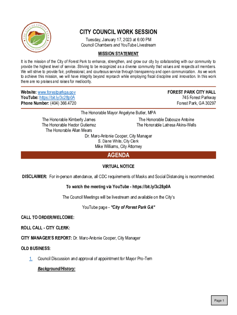 CITY COUNCIL WORK SESSION Tuesday, January 17, 2023, at 6:00 PM Council Chambers and YouTube Livestream MISSION STATEMENT It is the mission of the City of Forest Park to enhance, strengthen, and grow