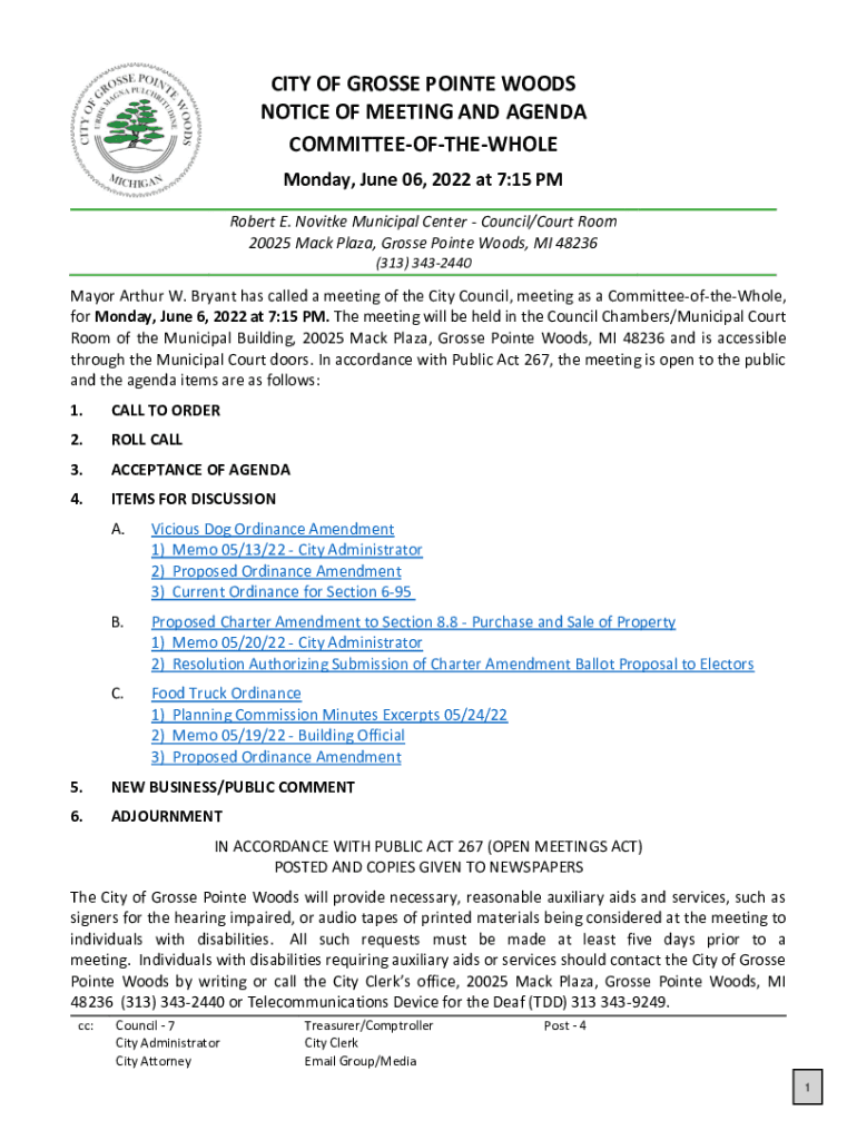 CITY OF GROSS POINT WOODS NOTICE OF MEETING AND AGENDA COMMITTEEOFTHEWHOLE Monday, June 06, 2022, at 7:15 PM Robert E. Novice Municipal Center Council/Court Room 20025 Mack Plaza, Gross Point Woods,