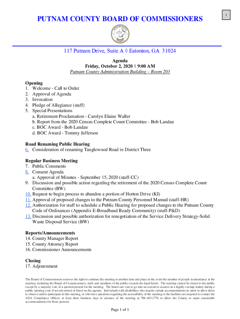 PUTNAM COUNTY BOARD OF COMMISSIONERS117 Putnam Drive, Suite A Eaton ton, GA 31024 Agenda Friday, October 2, 2020 9:00 AM Putnam County Administration Building Room 203 Opening 1. Welcome, Call to