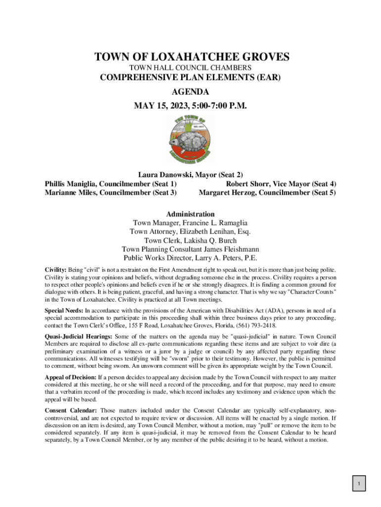 TOWN OF LOXAHATCHEE GROVES TOWN HALL COUNCIL CHAMBERSCOMPREHENSIVE PLAN ELEMENTS (EAR) AGENDA MAY 15, 2023, 5:007:00 P.M. Laura Wazowski, Mayor (Seat 2) Phillips Manila, Council member (Seat 1) Robert