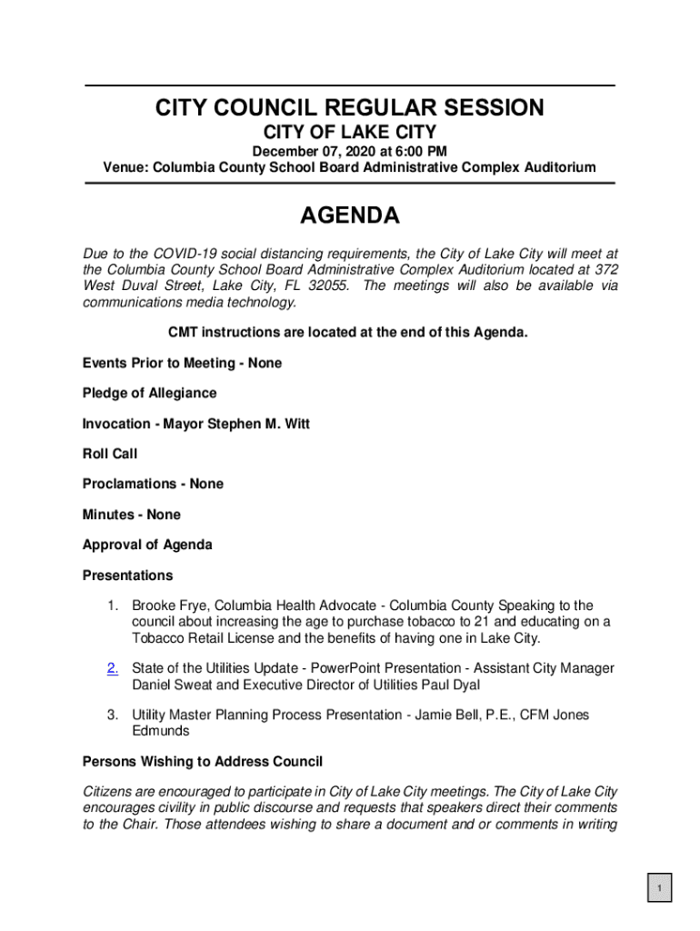 CITY COUNCIL REGULAR SESSION CITY OF LAKE CITY December 07, 2020, at 6:00 PM Venue: Columbia County School Board Administrative Complex AuditoriumAGENDA Due to the COVID-19 social distancing requirements,