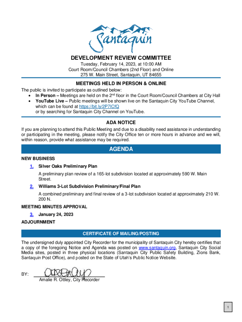 DEVELOPMENT REVIEW COMMITTEE Tuesday, February 14, 2023, at 10:00 AM Court Room/Council Chambers (2nd Floor) and Online 275 W. Main Street, Santa quin, UT 84655MEETINGS HELD IN PERSON & ONLINE The