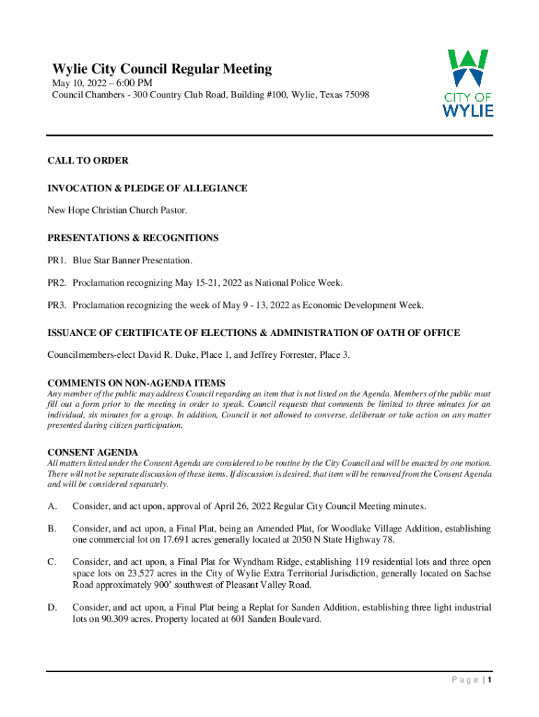 Wylie City Council Regular Meeting May 10, 2022 6:00 PM Council Chambers 300 Country Club Road, Building #100, Wylie, Texas 75098CALL TO ORDER INVOCATION & PLEDGE OF ALLEGIANCE New Hope Christian