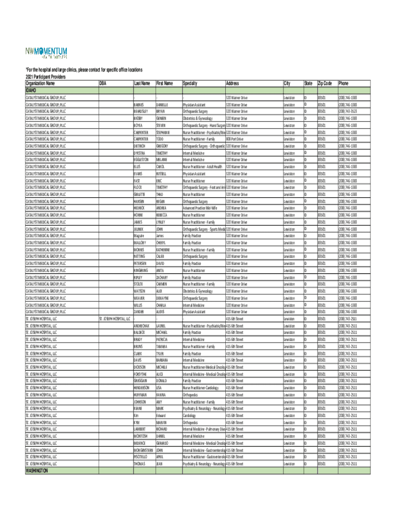 *For the hospital and large clinics, please contact for specific office locations 2021 Participant Providers Organization Name DBA Last Name IDAHO CATALYST MEDICAL GROUP, LLC CATALYST MEDICAL GROUP,
