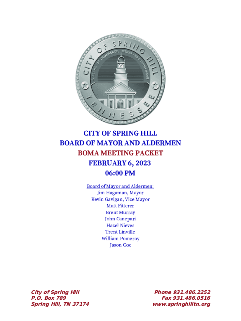 CITY OF SPRING HILL BOARD OF MAYOR AND ALDERMEN BOMB MEETING PACKET FEBRUARY 6, 2023 06:00 PM Board of Mayor and Aldermen: Jim Hartman, Mayor Kevin Gavilán, Vice Mayor Matt Bitterer Brent Murray