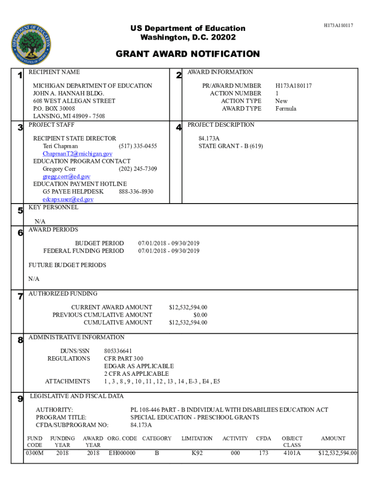 H173A180117US Department of Education Washington, D.C. 20202GRANT AWARD NOTIFICATION 135 6RECIPIENT NAME2MICHIGAN DEPARTMENT OF EDUCATION JOHN A. HANNAH BLDG. 608 WEST ALLEGED STREET P.O. BOX 30008