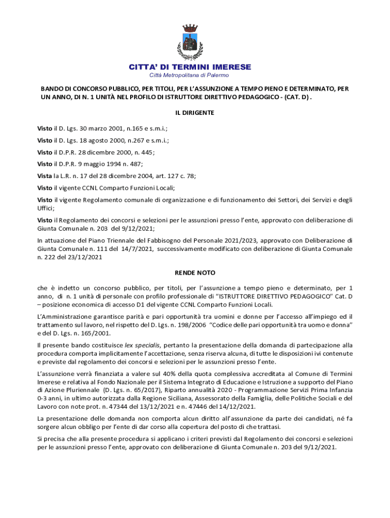 City Metropolitan di PalermoBANDO DI CONCERTO PUBLIC, PER TITLE, PER LASSUNZIONE A TEMPO PIANO E DETERMINATE, PER
