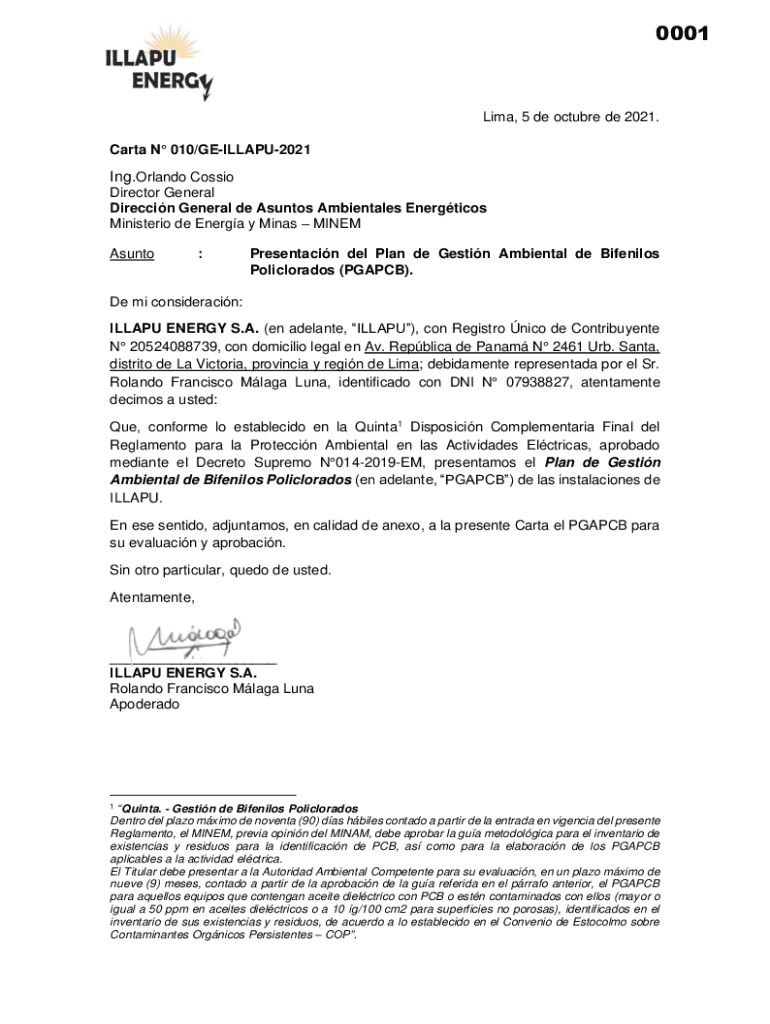0001Lima, 5 de October de 2021. CARTA N 010/GEILLAPU2021Ing. Orlando COSSIM Director General Direction General de Asuntos Ambient ales Energetics Minister de Energa y Mines MINE As unto:Presentation
