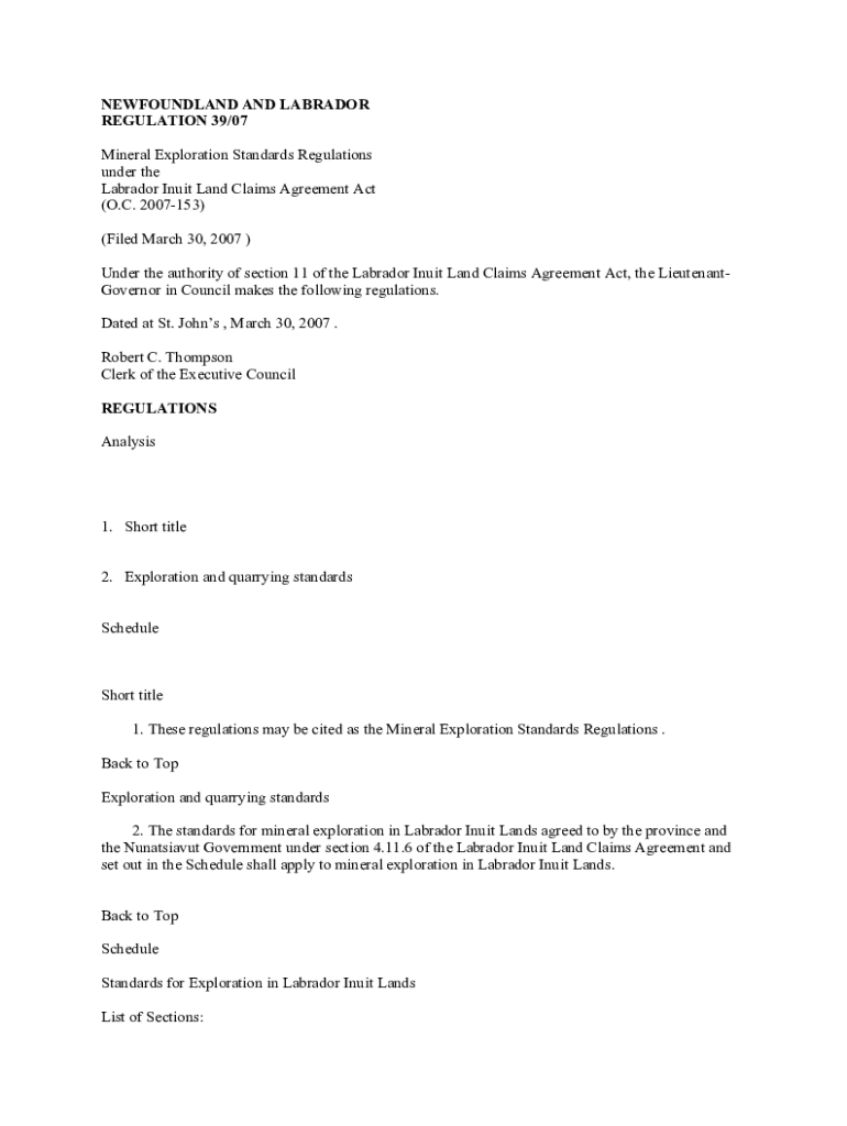 NEWFOUNDLAND AND LABRADOR REGULATION 39/07 Mineral Exploration Standards Regulations under the Labrador Inuit Land Claims Agreement Act (O.C. 2007153) (Filed March 30, 2007) Under the authority of
