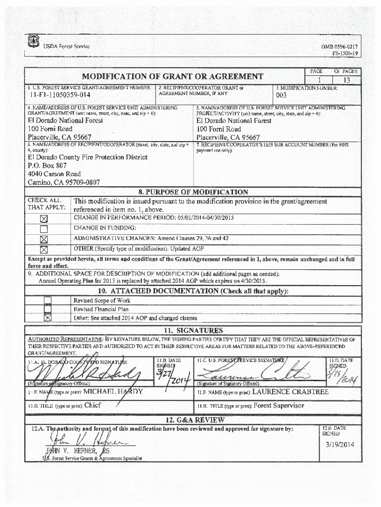 USDA Forest ServiceMODIFICATION OF GRANT OR AGREEMENT 1 U.S. FOREST SERVICE GRANT/AGREEMENT NUMBER:11F1110503590142. RECIPIENT/COOPERATOR GRANT or3. MODIFICAAGREEMENTNIJMBER, IF ANY:0034. NAME/ADDRESS