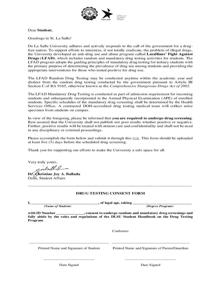 Dear Student, Greetings in St. La Sale! De La Sale University adheres and actively responds to the call of the government for a drug free nation. To support efforts to minimize, if not totally eradicate,