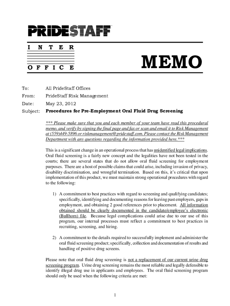 INTO MEMO F I C E To:All Pikestaff OfficesFrom:Pikestaff Risk ManagementDate:May 23, 2012Subject:Procedures for PreEmployment Oral Fluid Drug Screening *** Please make sure that you and each member