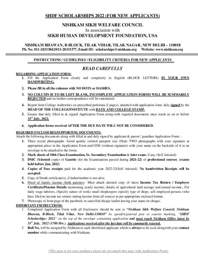 SHF SCHOLARSHIPS 2022 (FOR NEW APPLICANTS) MISHKAN SIKH WELFARE COUNCIL In association with SIKH HUMAN DEVELOPMENT FOUNDATION, USA MISHKAN SHAWN, BLOCK, TI LAK VICAR, TI LAK NAGAR, NEW DELHI 110018