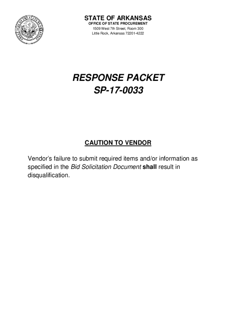 STATE OF ARKANSAS OFFICE OF STATE PROCUREMENT 1509 West 7th Street, Room 300 Little Rock, Arkansas 722014222RESPONSE PACKET SP170033CAUTION TO VENDOR Vendors failure to submit required items and/or