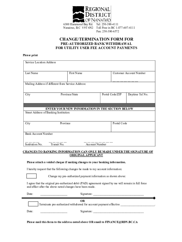 6300 Hammond Bay Rd. Tel: 2503904111 Nanaimo, B. C V9T 6N2 Toll Free in BC 18776074111 Fax: 2503906572CHANGE/TERMINATION FORM FOR PREAUTHORIZED BANK WITHDRAWAL FOR UTILITY USER FEE ACCOUNT PAYMENTS