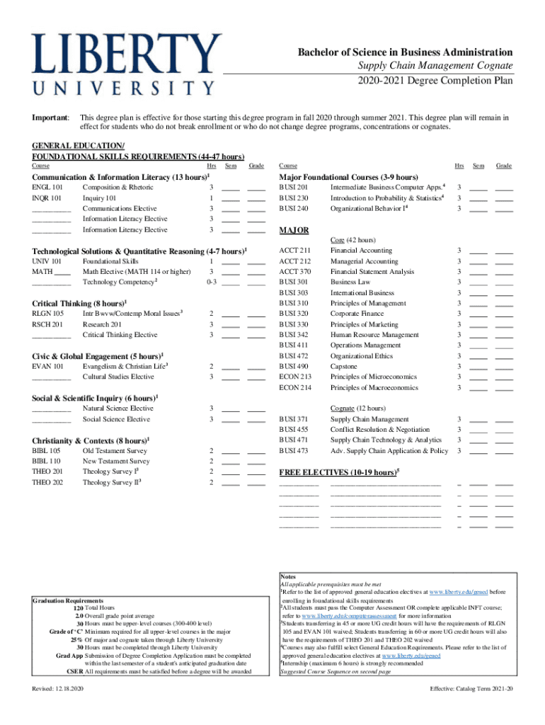 Bachelor of Science in Business Administration Supply Chain Management Cognate 20202021 Degree Completion Unimportant:This degree plan is effective for those starting this degree program in fall 2020