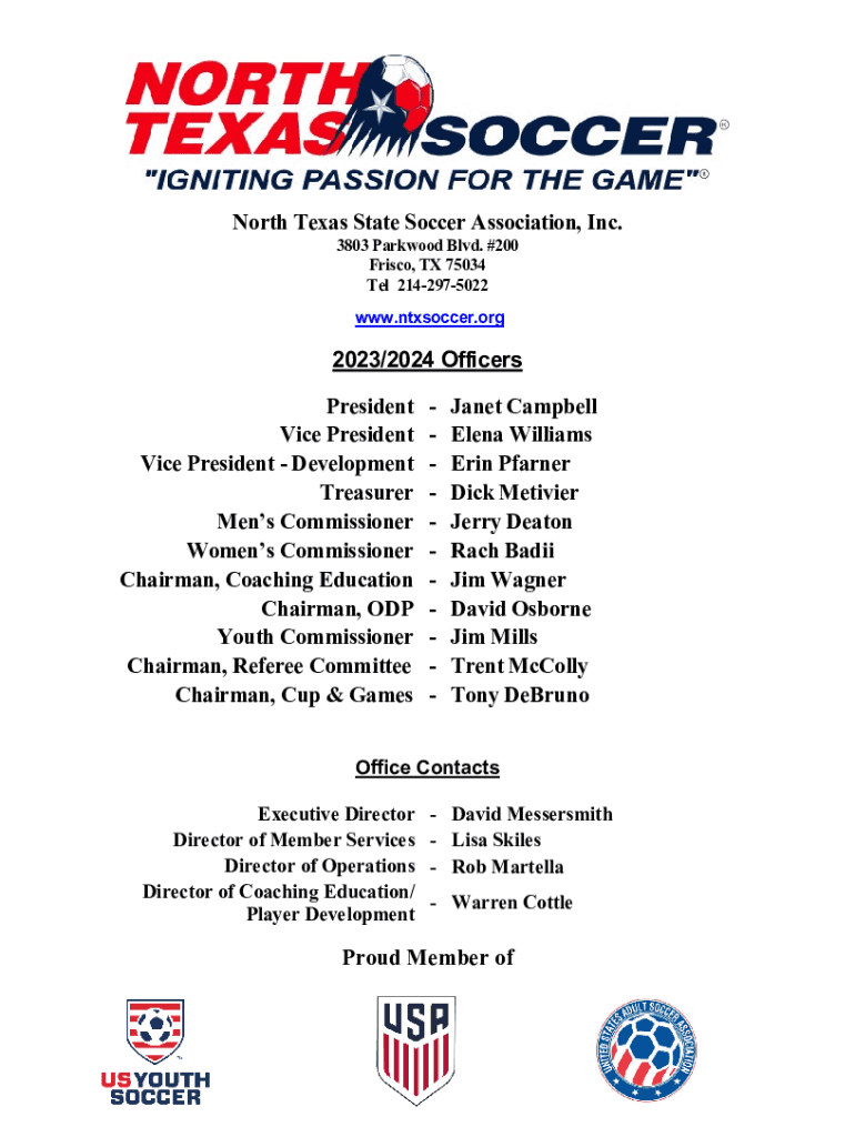 North Texas State Soccer Association, Inc. 3803 Park wood Blvd. #200 Frisco, TX 75034 Tel 2142975022 www.ntxsoccer.org2023/2024 Officers President Vice President Development Treasurer Men Commissioner