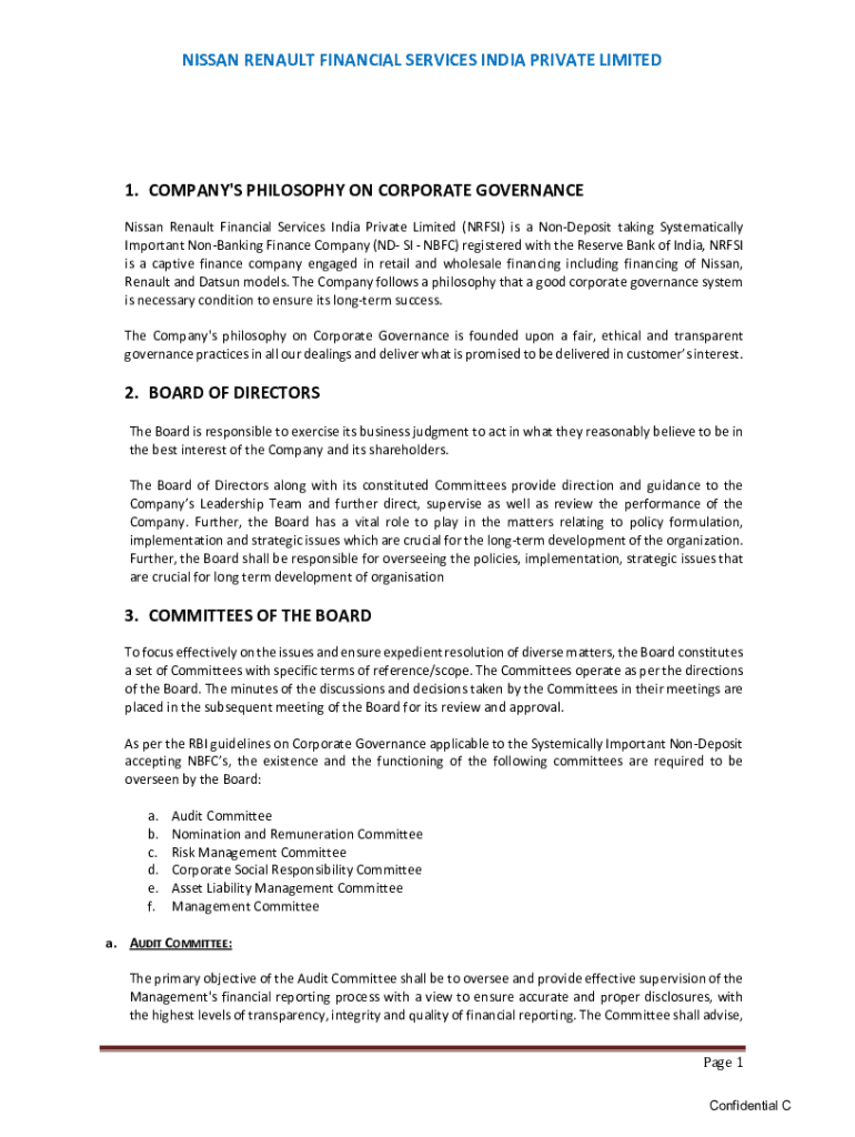NISSAN RENAULT FINANCIAL SERVICES INDIA PRIVATE LIMITED1. COMPANY\'S PHILOSOPHY ON CORPORATE GOVERNANCE Nissan Renault Financial Services India Private Limited (NR FSI) is a Deposit taking Systematically
