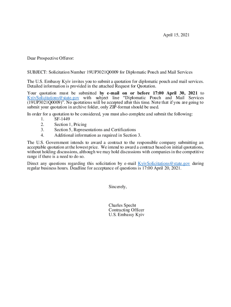 April 15, 2021Dear Prospective Offer or: SUBJECT: Solicitation Number 19UP3021Q0009 for Diplomatic Pouch and Mail Services The U.S. Embassy Kyiv invites you to submit a quotation for diplomatic pouch
