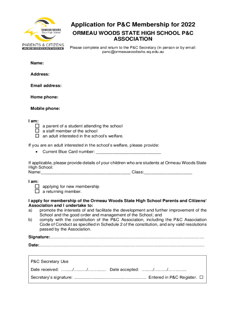 Application for P&C Membership for 2022 ORM EAU WOODS STATE HIGH SCHOOL P&C ASSOCIATION Please complete and return to the P&C Secretary (in person or by email: panc@ormeauwoodsshs.eq.edu.auName: Address: