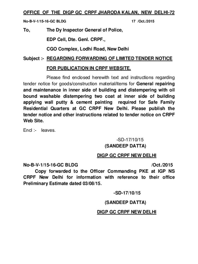 OFFICE OF THE DIG PGC RPF BARODA ALAN, NEW DELHI72 NoBV1/1516GC Bldg,17 /Oct./2015The Dy Inspector General of Police, EDP Cell, Due. Gene. RPF., CGO Complex, Lodi Road, New DelhiSubject : REGARDING