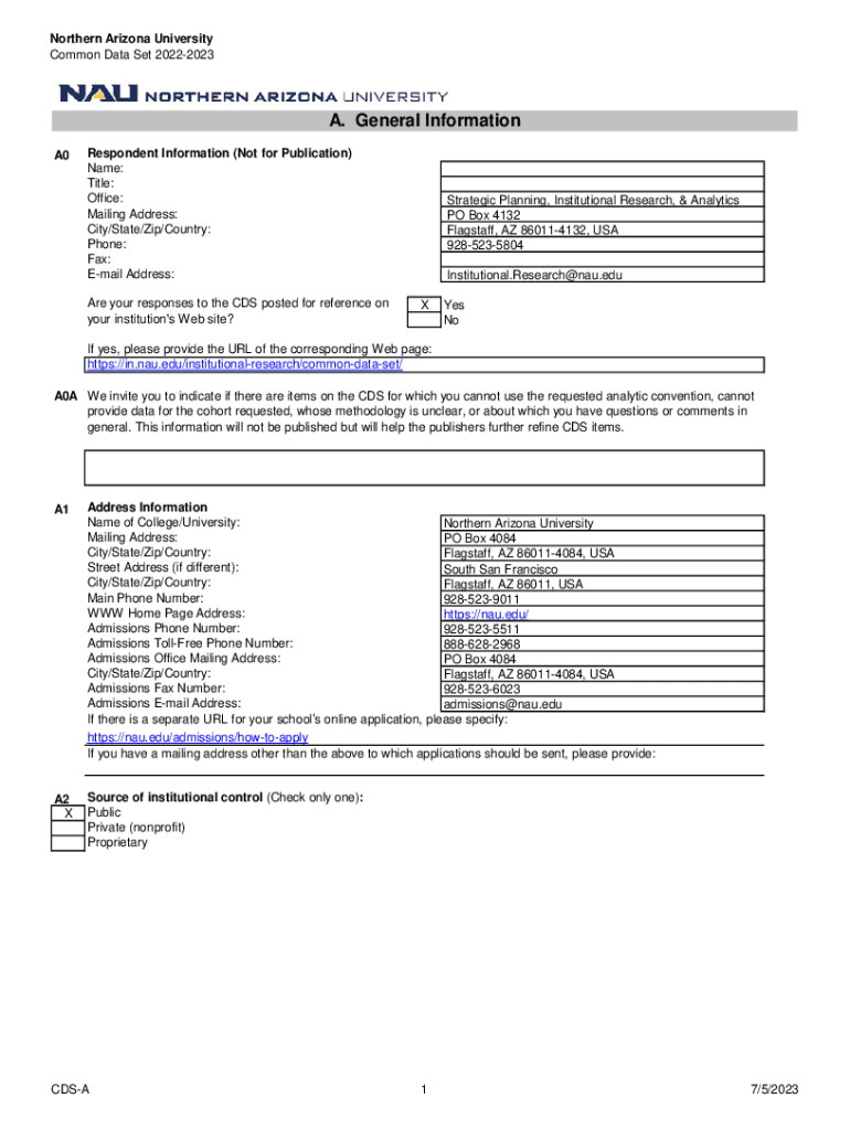 Northern Arizona University Common Data Set 20222023A. General Information A0Respondent Information (Not for Publication) Name: Title: Office: Mailing Address: City/State/Zip/Country: Phone: Fax: