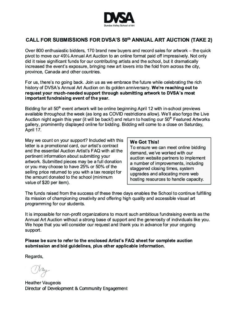 CALL FOR SUBMISSIONS FOR DV SAS 50th ANNUAL ART AUCTION (TAKE 2) Over 800 enthusiastic bidders, 170 brand-new buyers and record sales for artwork the quick pivot to move our 49 Annual Art Auction
