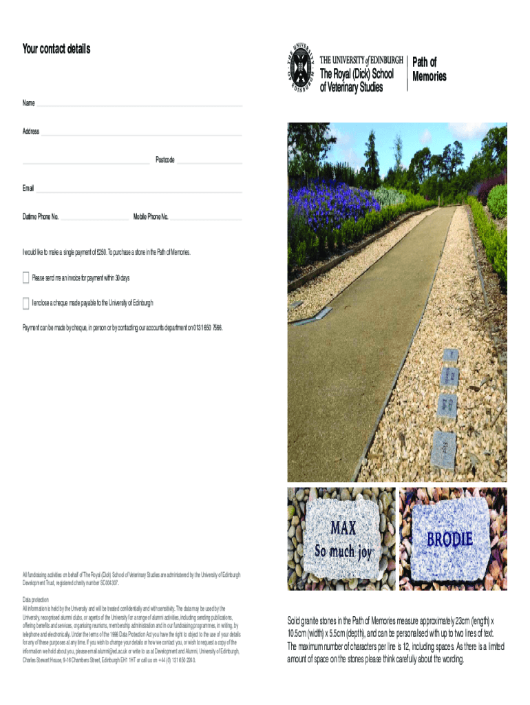 Your contact detailsPath of MemoriesName AddressPostcodeEmail Daytime Phone No. Mobile Phone No. I would like to make a single payment of 250. To purchase a stone in the Path of Memories. Please send
