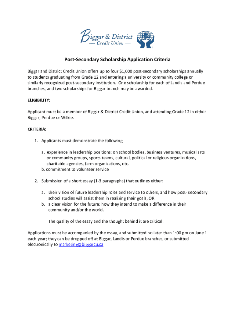 PostSecondary Scholarship Application Criteria Bigger and District Credit Union offers up to four $1,000 postsecondary scholarships annually to students graduating from Grade 12 and entering a university