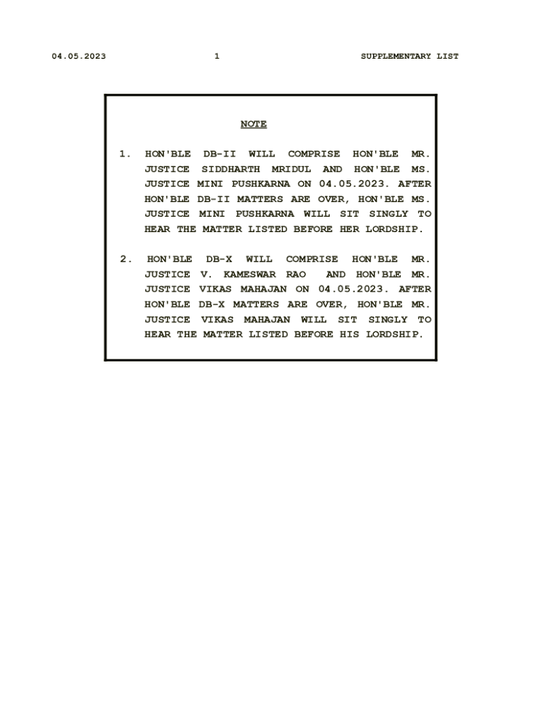 04.05.20231SUPPLEMENTARY FISTNOTE 1.HON\'BLED BII WILL COMPRISE HON\'BLE MR. JUSTICE SIDDHARTH BRIDAL AND HON\'BLE MS. JUSTICE MINI PUSHKIN ON 04.05.2023. AFTER HON\'BLED BII MATTERS ARE OVER, HON\'BLE