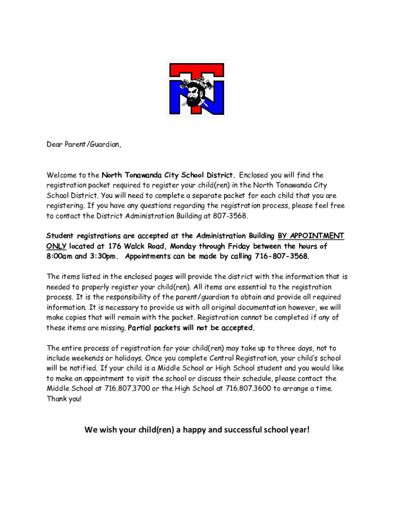 Dear Parent/Guardian, Welcome to the North Lawanda City School District. Enclosed you will find the registration packet required to register your child(men) in the North Lawanda City School District.