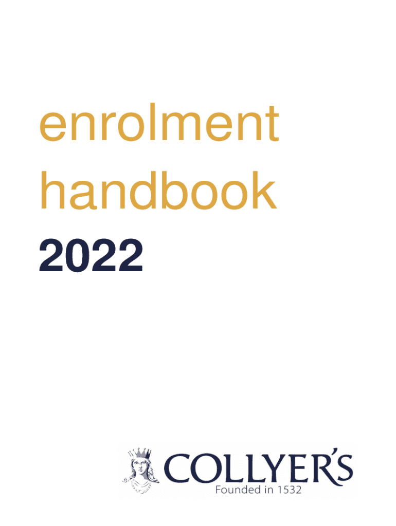 Enrollment handbook 2022ENROLMENT HANDBOOK CONTENTSPage1. 2. 3 4. 5. 6. 7. 8. 9. 10. 11. 12. 13. 14. 18. 19. 20. Welcome to Colliers Enrollment Interview An Introduction to Sixth Form Colliers 360