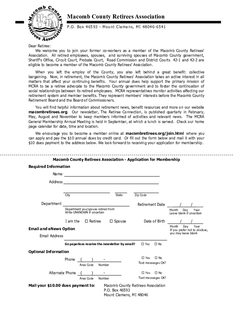 Macomb County Retirees Association P.O. B ox 46593 Mount Clem ens, MI 480466541Dear Retiree: We welcome you to join your former coworkers as a member of the Macomb County Retirees\' Association. All