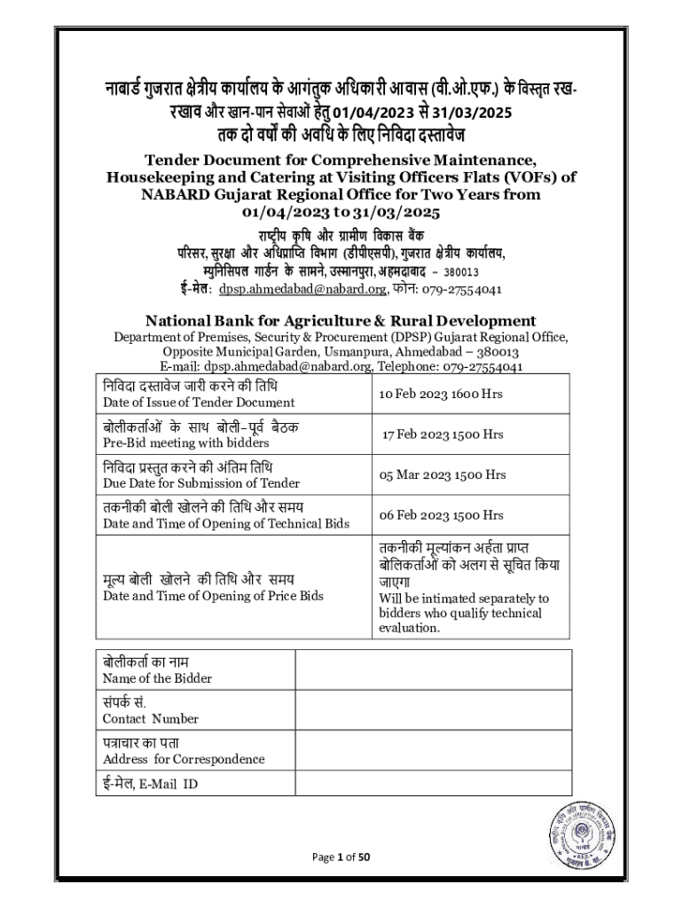 (...) 01/04/2023 31/03/2025 Tender Document for Comprehensive Maintenance, Housekeeping and Catering at Visiting Officers Flats (Vows) of NAB ARD Gujarat Regional