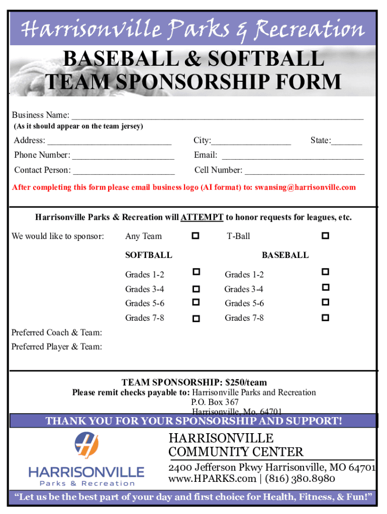 Harrisonville Parks & Recreation BASEBALL & SOFTBALL TEAM SPONSORSHIP FORM Business Name: ___ (As it should appear on the team jersey)Address: ___City:___State:___Phone Number: ___Email: ___Contact