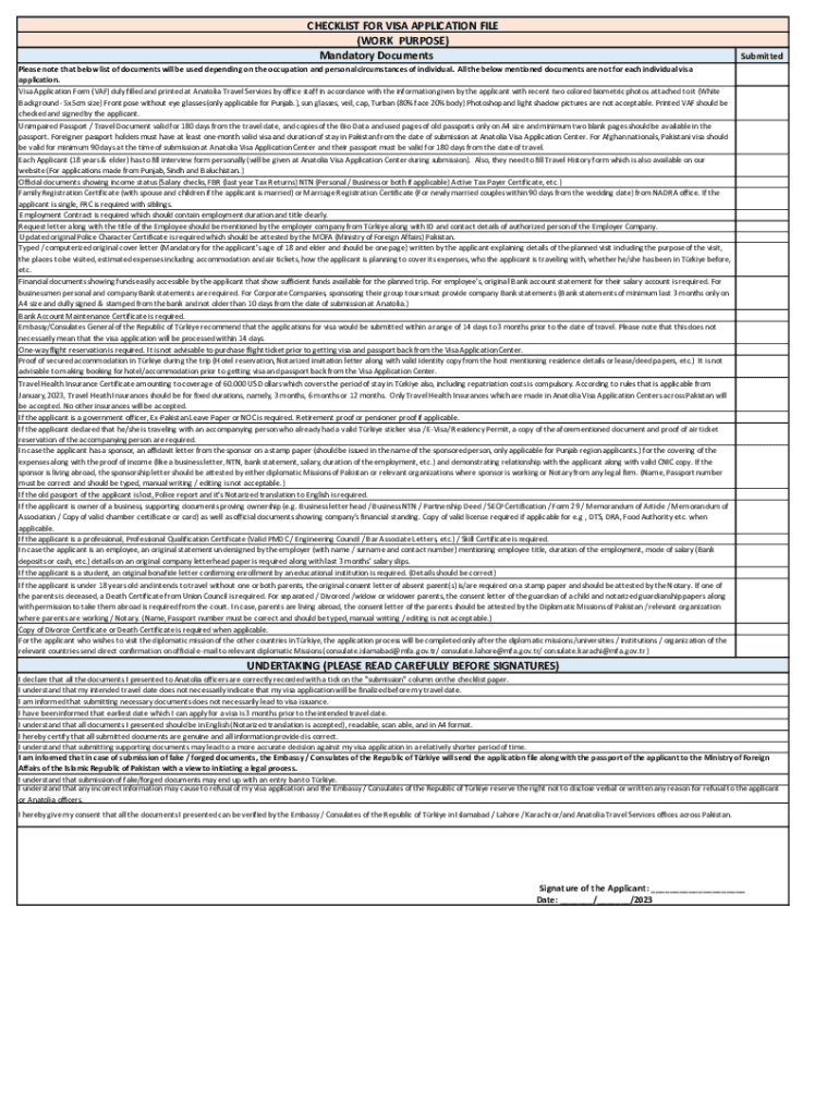 CHECKLIST FOR VISA APPLICATION FILE (WORK PURPOSE) Mandatory DocumentsSubmittedPlease note that below list of documents will be used depending on the occupation and personal circumstances of individual.