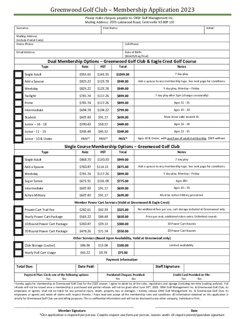 Greenwood Golf Club Membership Application 2023 Please make checks payable to: OK Golf Management Inc. Mailing Address: 2075 Lakewood Road, Centreville NS B0P 1J0 Surname:First Name:Mailing Address: