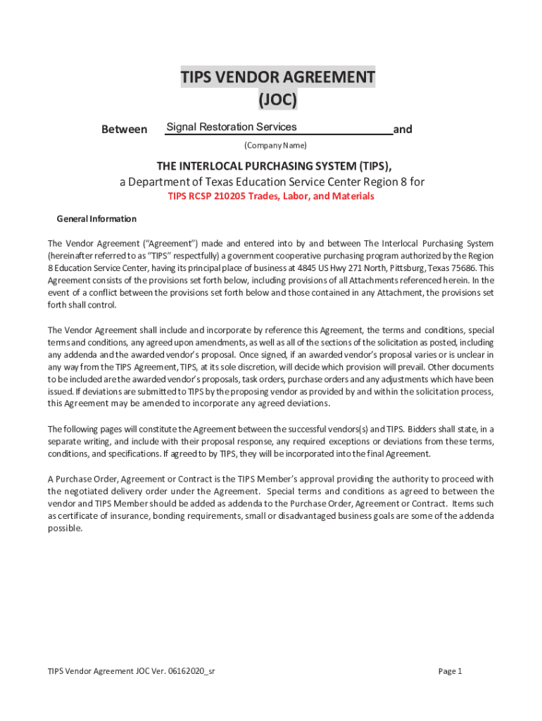 TIPS VENDOR AGREEMENT (JOC) BetweenSignal Restoration Service sand(Company Name)THE INTERLOCK PURCHASING SYSTEM (TIPS), a Department of Texas Education Service Center Region 8 for TIPS RCMP 210205