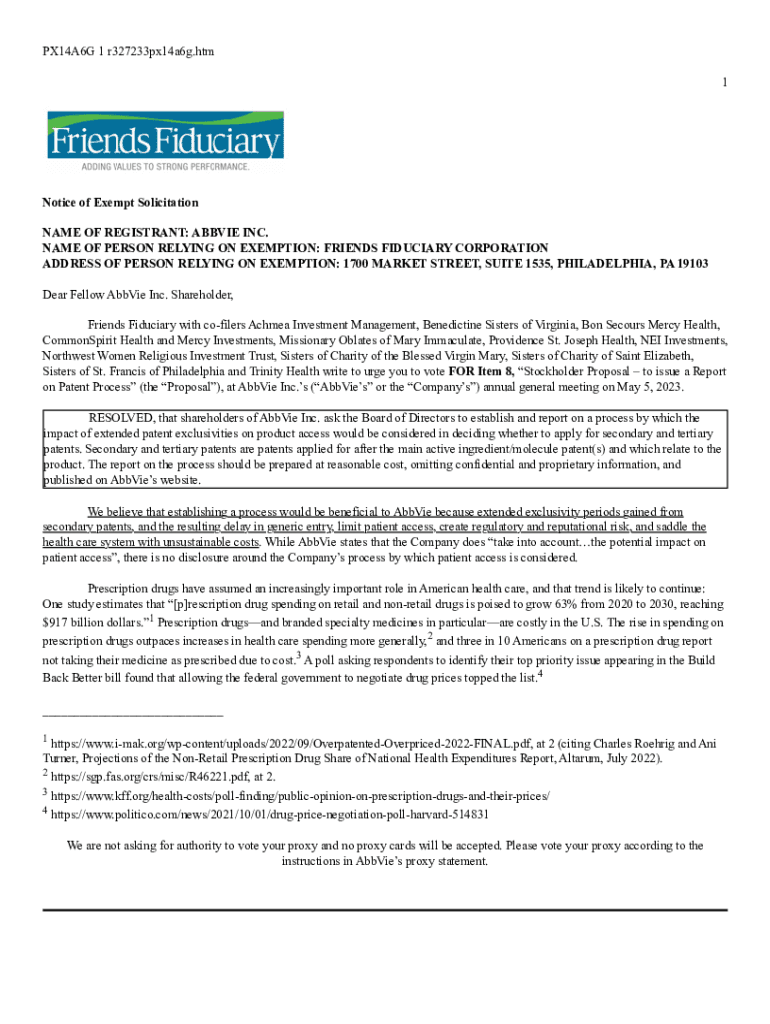 PX14A6G 1 r327233px14a6g.htm 1 Notice of Exempt Solicitation NAME OF REGISTRANT: ABBIE INC. NAME OF PERSON RELYING ON EXEMPTION: FRIENDS FIDUCIARY CORPORATION ADDRESS OF PERSON RELYING ON EXEMPTION: