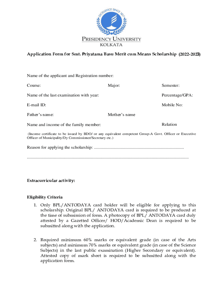 Application Form for SMT. Priyanka Base Merit come Means Scholarship (20222023)Name of the applicant and Registration number: Course:Major:Semester:Name of the last examination with year:Percentage/GPA:Email