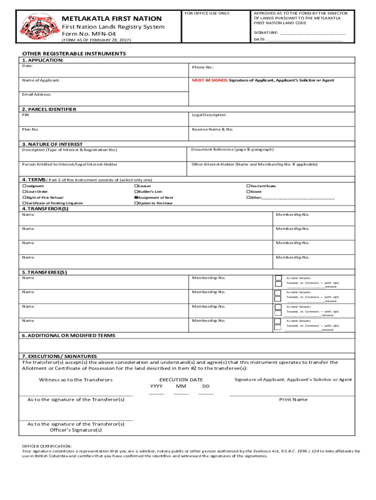 METADATA FIRST NATIONAL OFFICE USE ONLY:First Nation Lands Registry System Form No. MFN04APPROVED AS TO THE FORM BY THE DIRECTOR OF LANDS PURSUANT TO THE METADATA FIRST NATION LAND CODE SIGNATURE:
