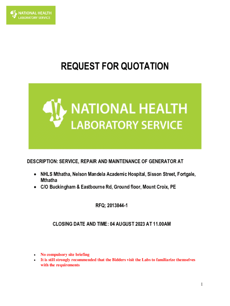 REQUEST FOR QUOTATIONDESCRIPTION: SERVICE, REPAIR AND MAINTENANCE OF GENERATOR AT