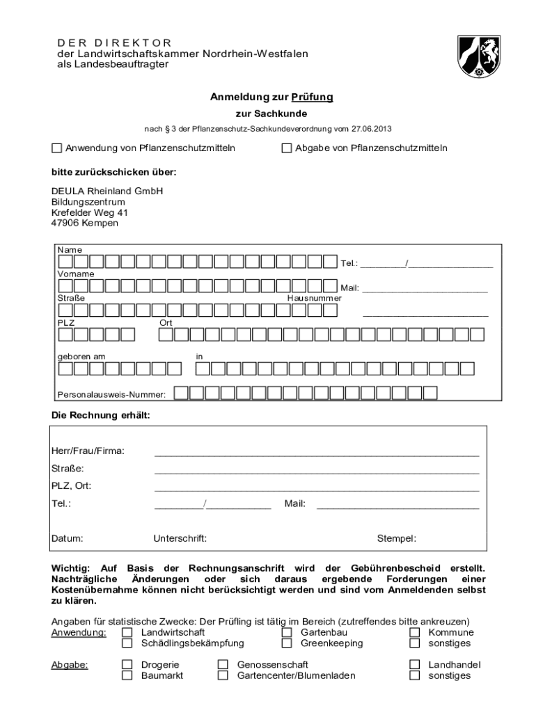 Deula Kempen - Start muss von allen neuen Teilnehmern und Interessierten an den Bildungsangeboten der DEULA Kempen eingereicht werden.