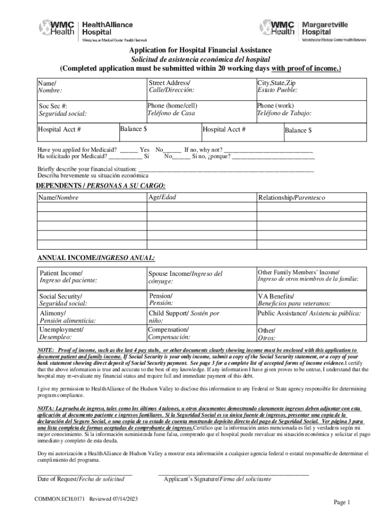 Application for Hospital Financial Assistance Solicited de asistencia econ mica Del hospital (Completed application must be submitted within 20 working days with proof of income.) Name/ Hombre:Street