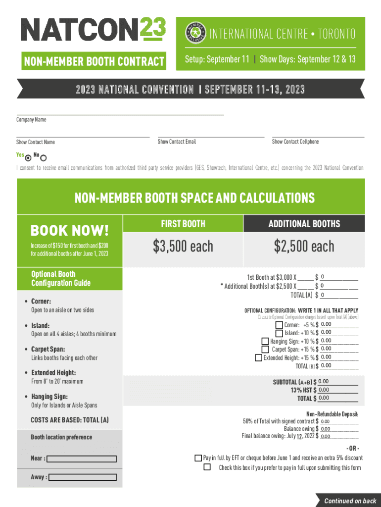INTERNATIONAL Center TORONTO MB NONMEMBER BOOTH CONTRACTUAL SI Setup: September 11 | Show Days: September 12 & 132023 NATIONAL CONVENTIONSEPTEMBER 1113, 2023Company Name Show Contact Email Show Contact