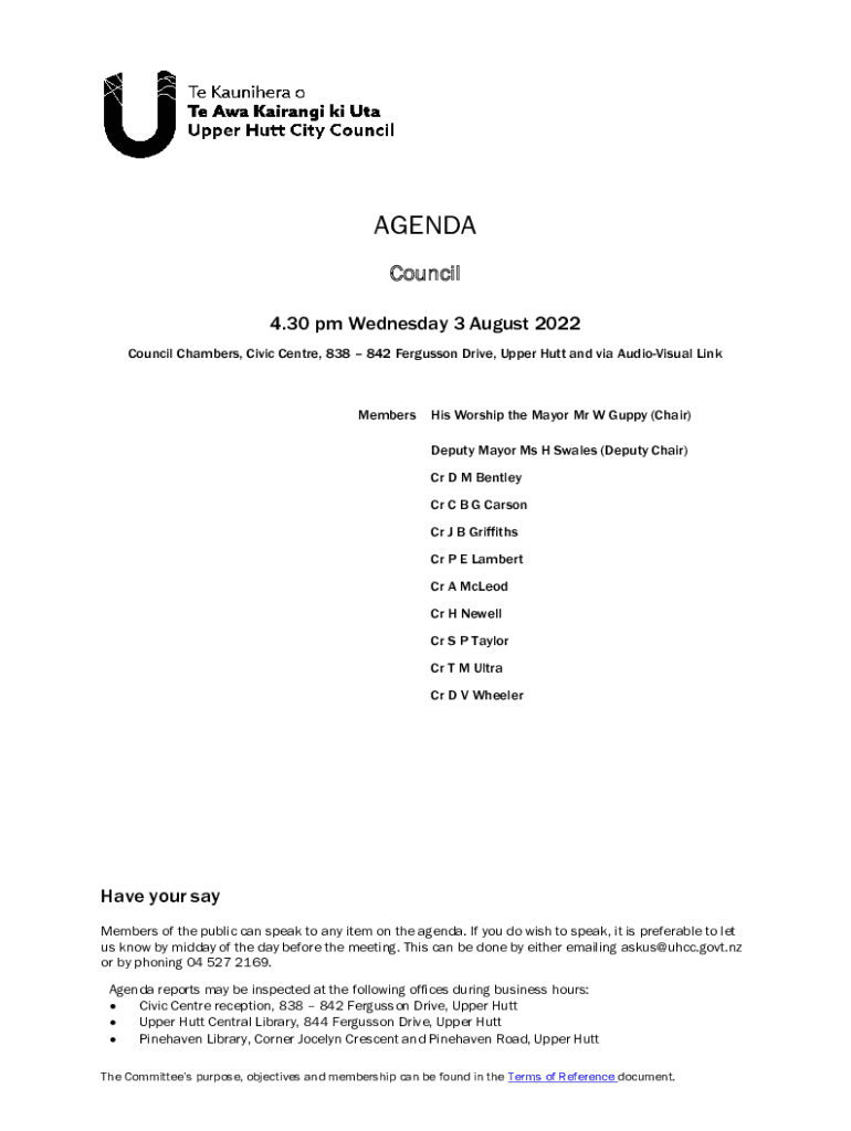 AGENDA Council 4.30 pm Wednesday 3 August 2022 Council Chambers, Civic Center, 838 842 Ferguson Drive, Upper Hunt and via Audiovisual LinkMembersHis Worship the Mayor Mr W Guppy (Chair) Deputy Mayor