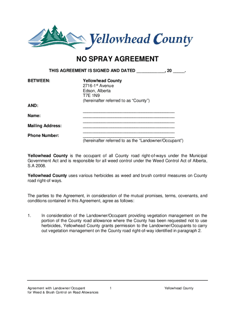 NO SPRAY AGREEMENT THIS AGREEMENT IS SIGNED AND DATED ___, 20 ___. BETWEEN:Yellow head County 27161st Avenue Edson, Alberta T7E 1N9 (hereinafter referred to as County)AND: Name: Mailing Address: Phone