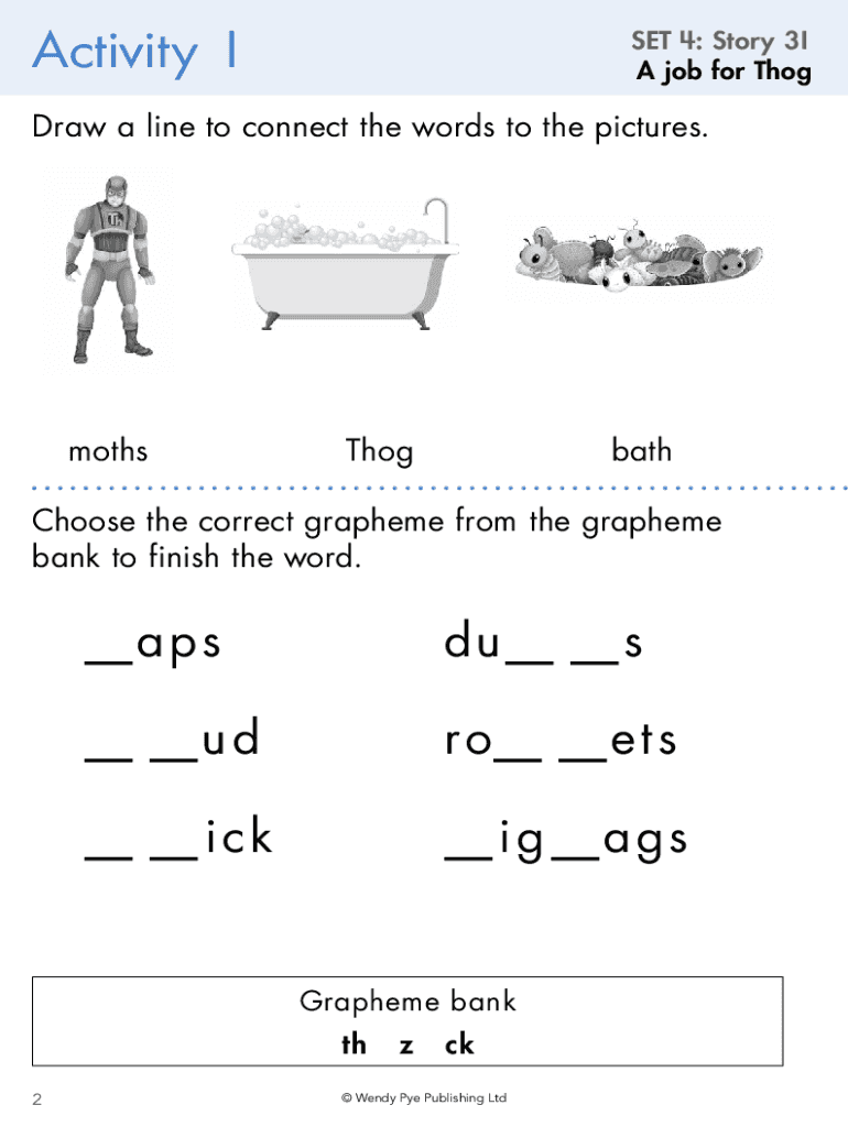 Activity 1SET 4: Story 31 A job for Thorax a line to connect the words to the pictures.mothsThogbathChoose the correct grapheme from the grapheme bank to finish the word._a p SD u_ _ s_ _UDR_ _e t