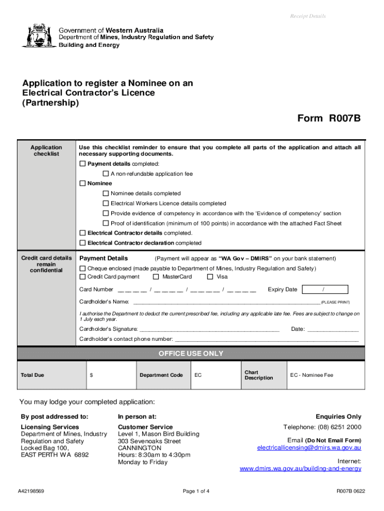 Receipt DetailsApplication to register a Nominee on an Electrical Contractors License (Partnership)Form R007B Application checklists this checklist reminder to ensure that you complete all parts of